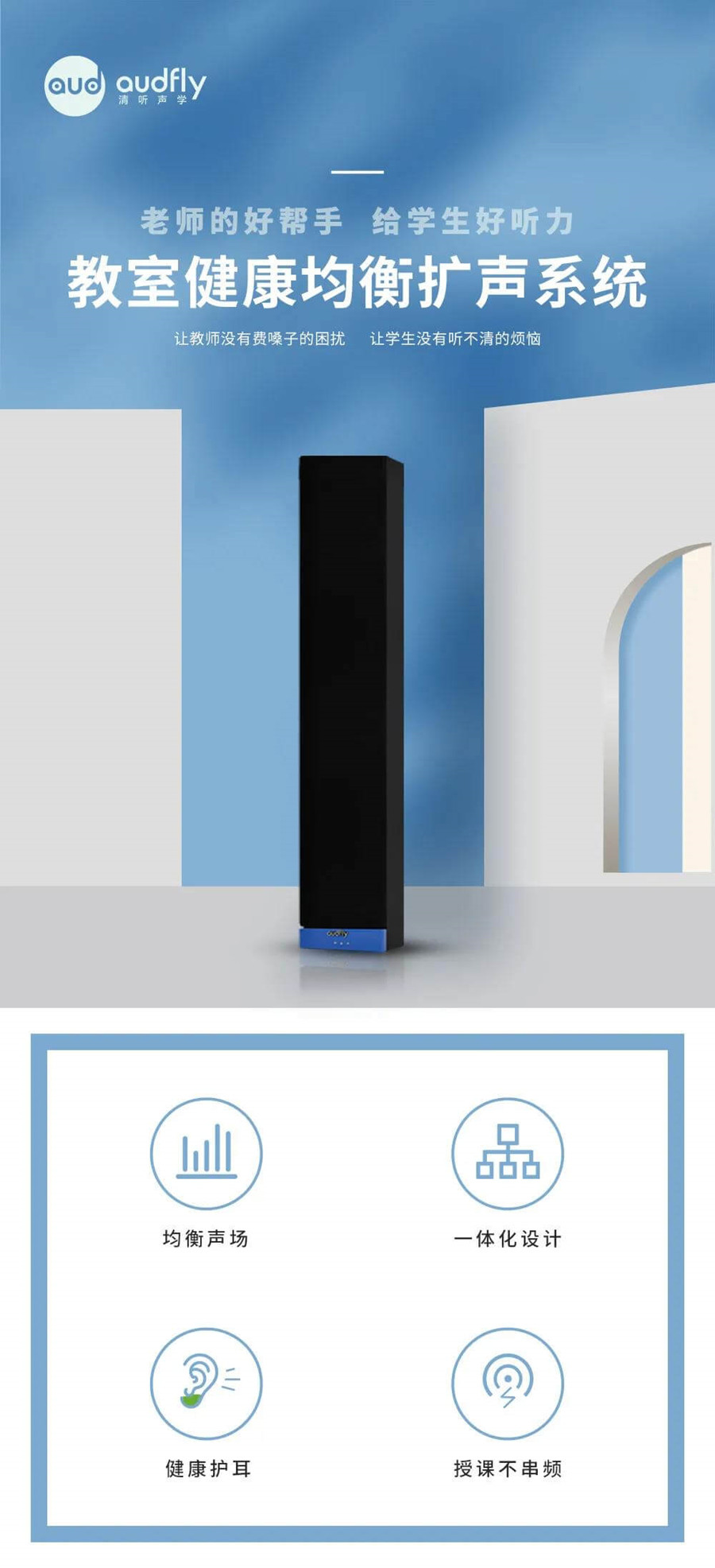 清聽聲學(xué)利用自身的聲學(xué)積淀和優(yōu)勢,獨(dú)家推出“安靜校園”解決方案,賦能校園聲環(huán)境的改善,方案包含3個(gè)模塊:教學(xué)均衡擴(kuò)聲系統(tǒng)、安靜操場以及定向音響文化氛圍營造等。