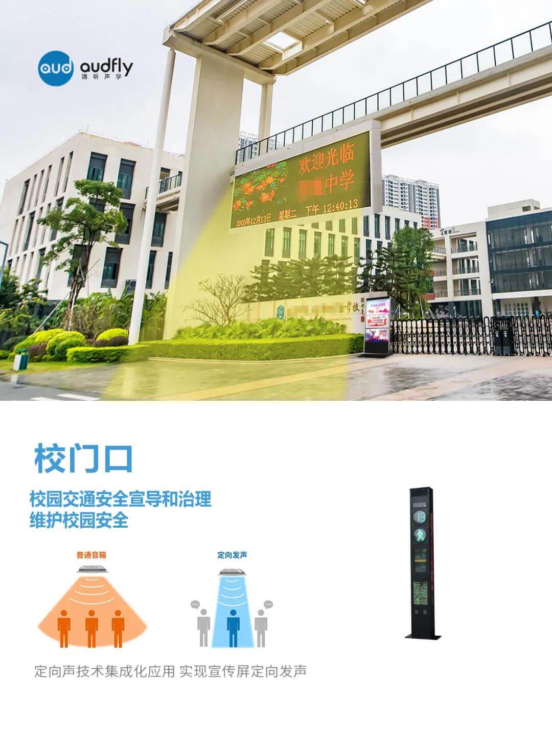 學校操場定向廣播系統,利用定向聲技術,實現聲音分區控制,將聲音控制在操場范圍內清晰傳播,有效解決了傳統操場全向聲廣播系統對教學樓、辦公樓及附近居民樓造成噪音擾民的問題;通過聲場設計,實現操場聲場均衡,解決傳統操場廣播混響、聲音異步、延時等問題,增強語音清晰度與可懂度,幫助營造健康向上的操場聲環境,助力陽光體育活動開展,推動科技生態校園建設。